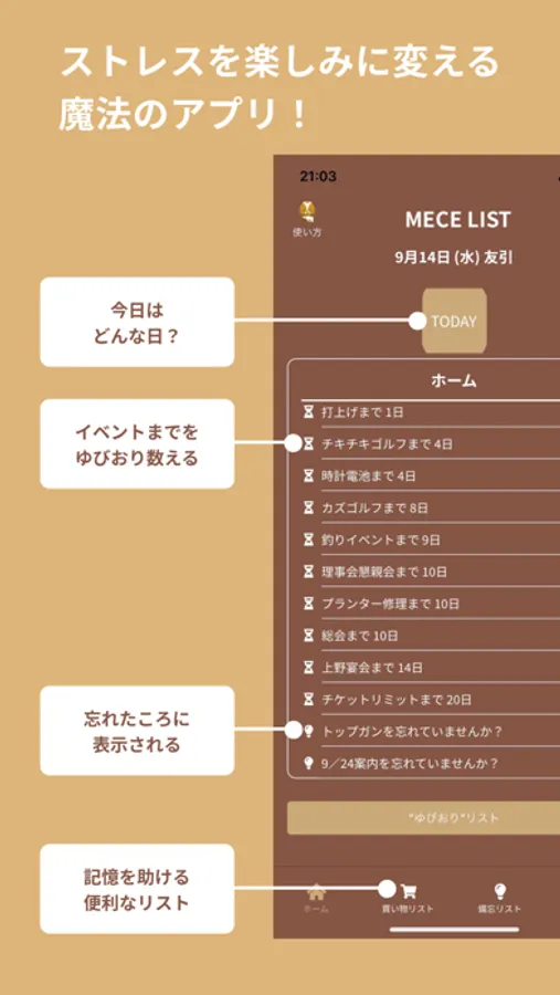ホーム画面に、登録したイベントが「あと〇日」と表示されます。まさに楽しみを“ゆびおり“数える感覚です。