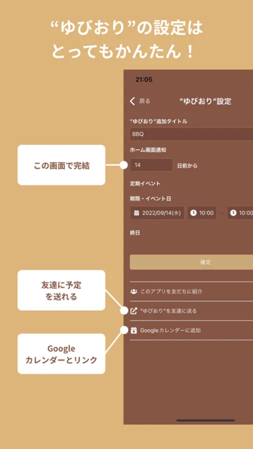 さらに”ゆびおり“をともだちと共有できるので、同じ感覚でイベント当日を迎えることができます。Googleカレンダーともリンクしているのでプライベートな予定を一元管理できます。