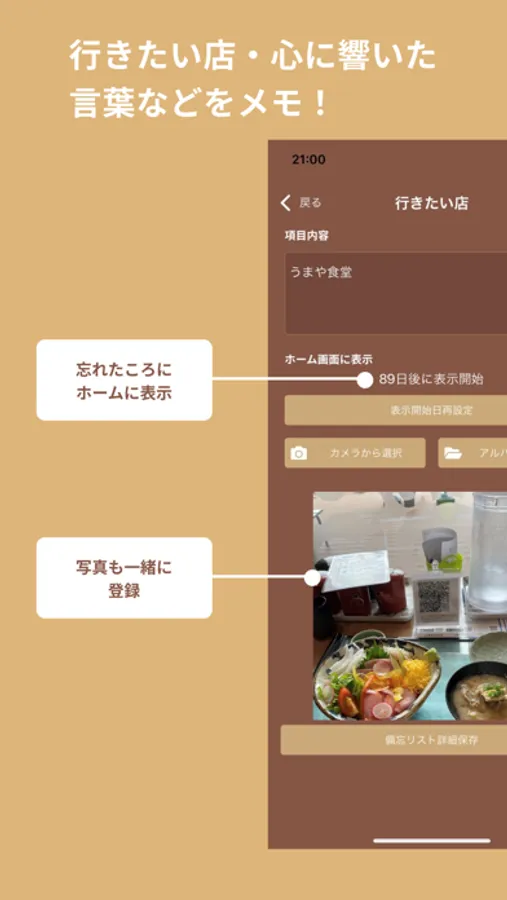 覚えておきたいこと(例えばテレビに出ていたおいしそうなお店や雑誌に載っていた観光地)をカテゴリーごとに登録できて、忘れたころにホーム画面に表示できます。