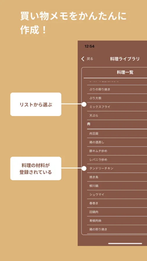 買い物の買い忘れをなくすための機能。料理のメニュごとに材料が登録されているので、そのままリストとして使えます。