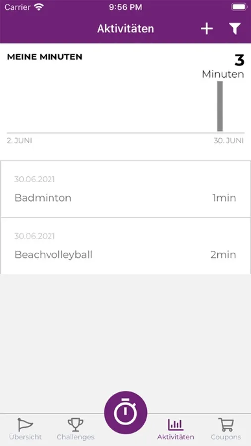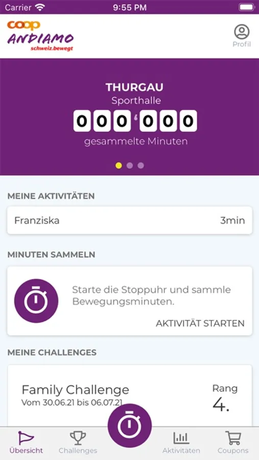 Via App können vom 14. August bis 25. September Bewegungsminuten in Sport- und Bewegungsaktivitäten gesammelt werden (Joggen, Spazieren, Velofahren, Tennis, Turnen, etc.). Du kannst alle deine Aktivitäten und Bewegungsminuten via Start/Stopp-Funktion oder manuell in der App speichern.