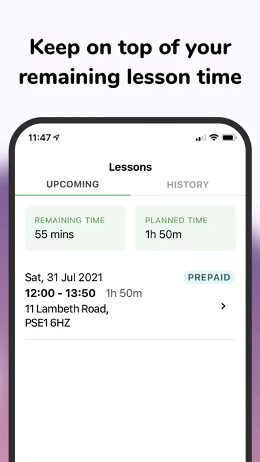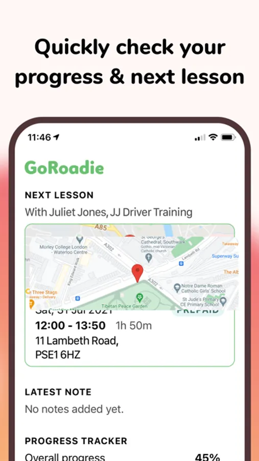Use the GoRoadie app to know when your next driving lesson is coming up, see your progress and latest notes from your last lesson and keep track of the time you have remaining time you have for lesson that you've already paid for.