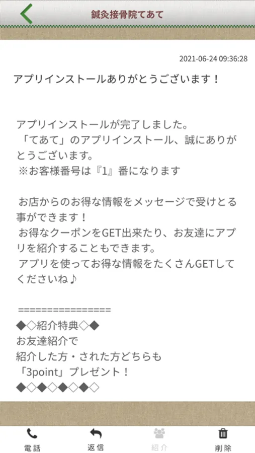 てあて 鍼 接のアプリをSNSを通じてお友達に紹介する事ができます。