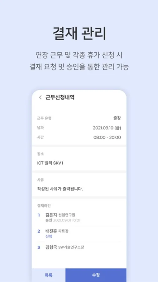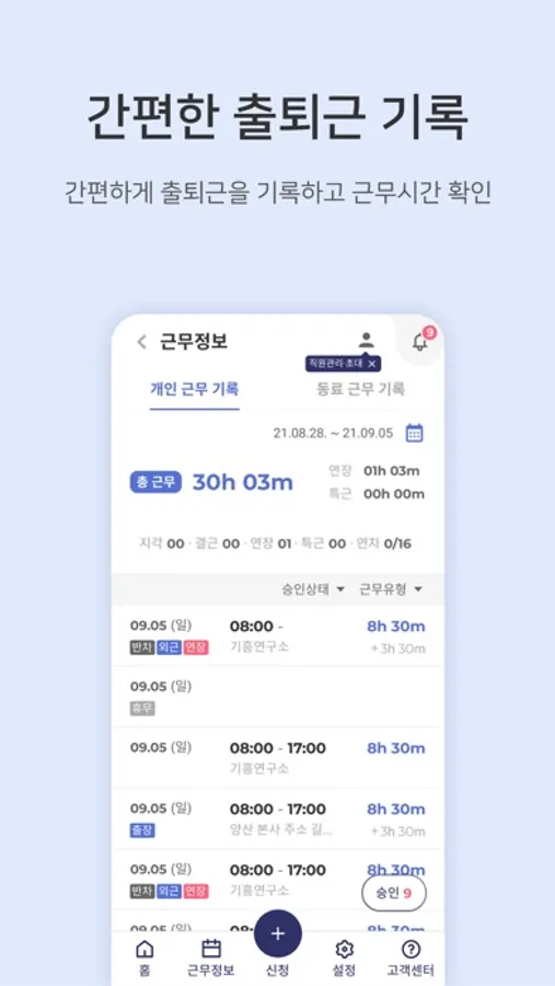 출장과 외근, 재택근무, 원격근무, 특근, 연장근무 신청을 간편하게 할수 있으며