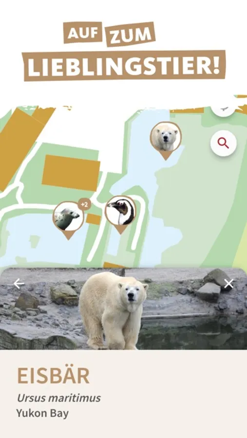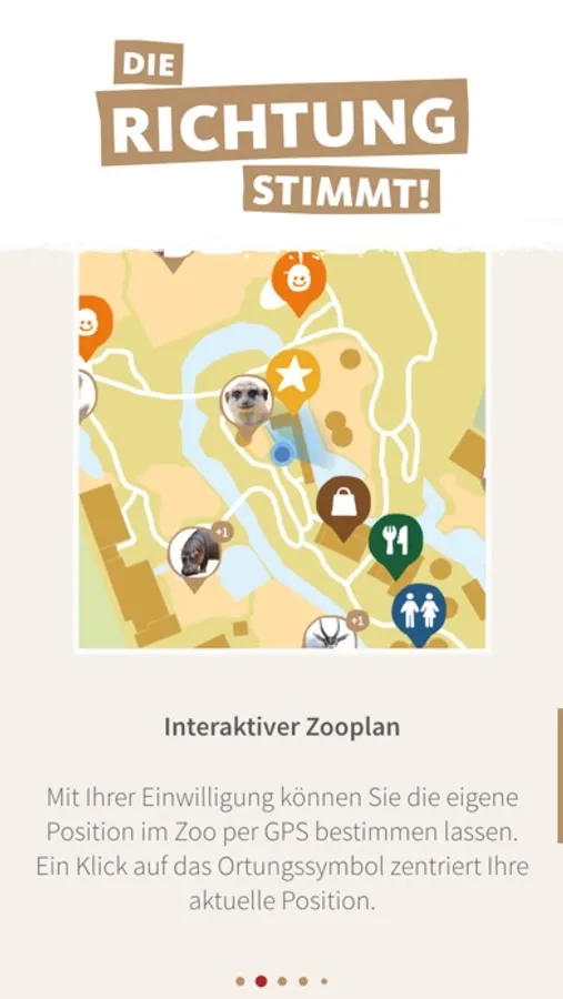 Mit Ihrer Einwilligung können Sie die eigene Position im Zoo per GPS bestimmen lassen. So sehen Sie sofort, was gerade in Ihrer Nähe ist und wie sie zum nächsten Highlight gelangen.