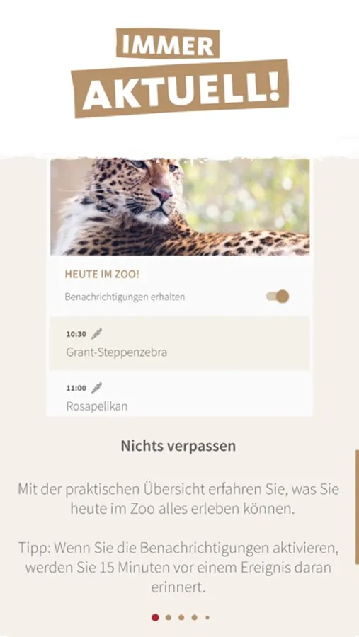 Verpassen Sie keine kommentierte Fütterung und keine Tiervorstellung mehr. Der übersichtliche Zeitplan zeigt Ihnen alle bevorstehenden Events im Zoo für Ihren Besuchstag an. Neu: Mit Erinnerungsfunktion!