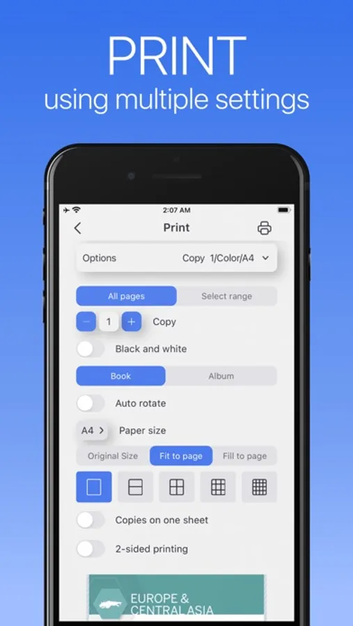 - Wide settings options: paper size, orientation, range, borders, 1/2-sided printing, color/bw/grayscale and many more