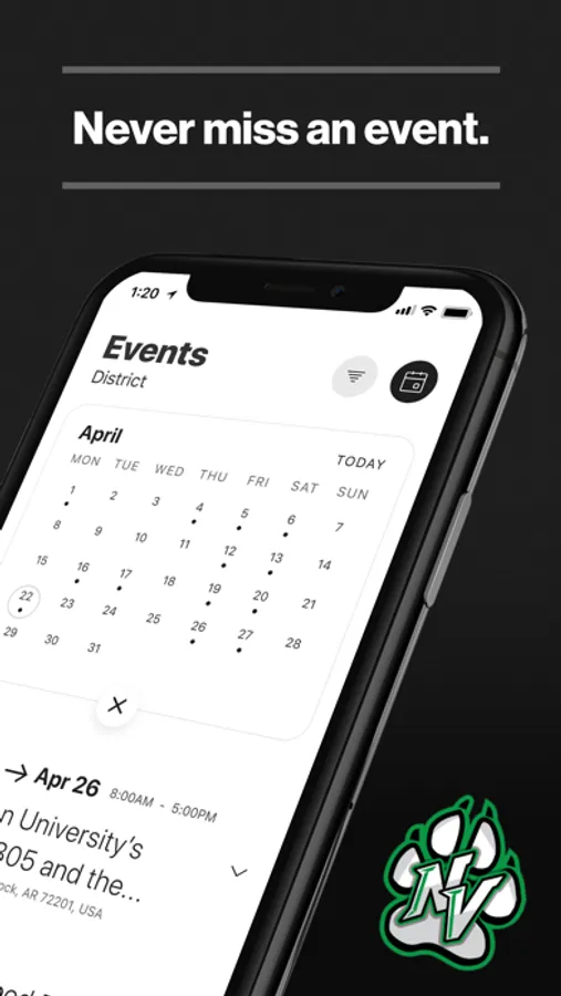 The event section shows a list of events throughout the district. Users can add an event to your calendar to share the event with friends and family with one tap.