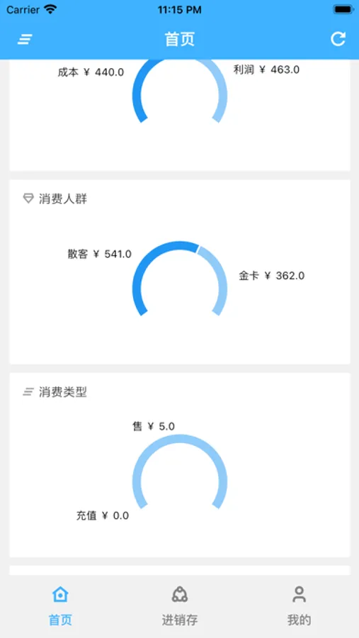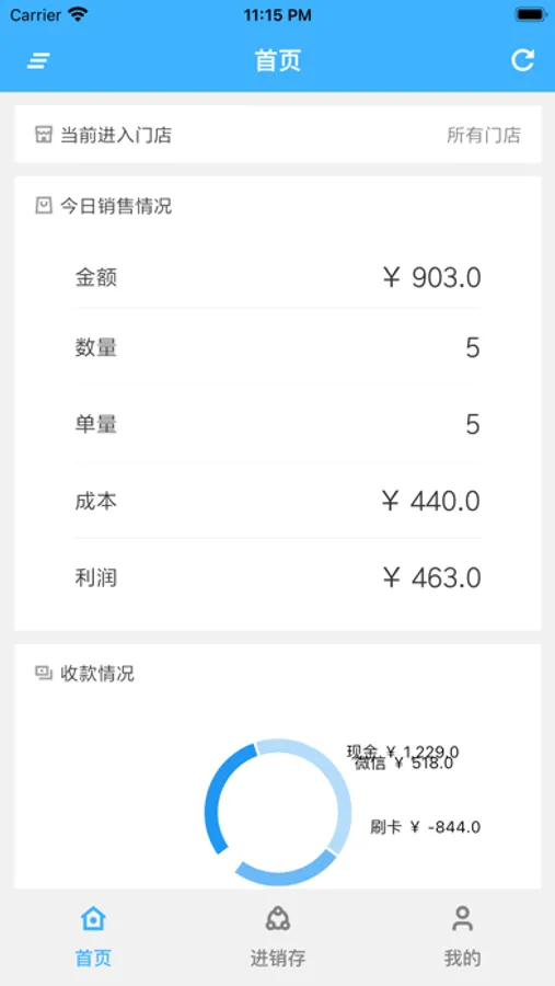 1.总览统计:显示当天的销售业绩统计、剩余库存,汇总整个进销存业务数据让业务状态一目了然。