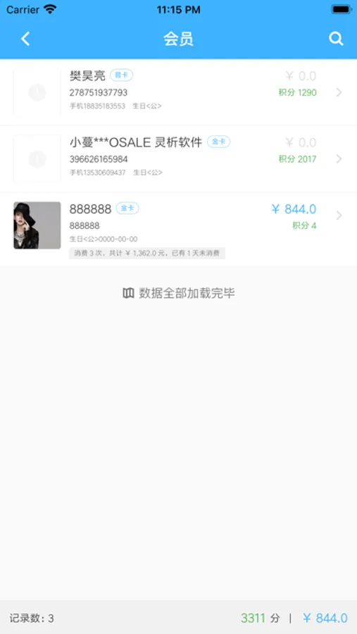 5.会员查询:查询会员详细信息、消费明细、积分记录、充值记录