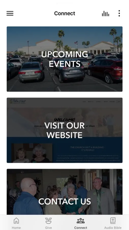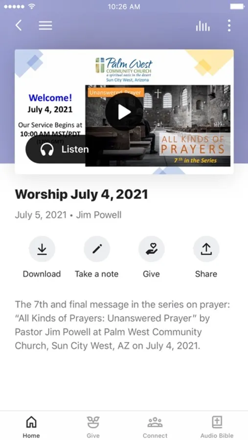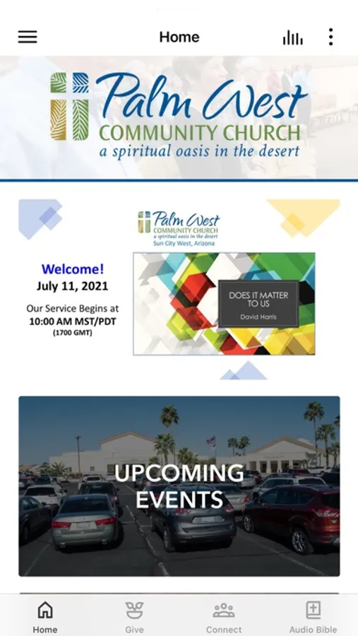 This app will help you stay connected with the day-to-day life at Palm West Community Church! With this app you can: watch or listen to past messages; stay up to date with push notifications; share your favorite messages via Twitter, Facebook, or email, access info on upcoming events, and more.