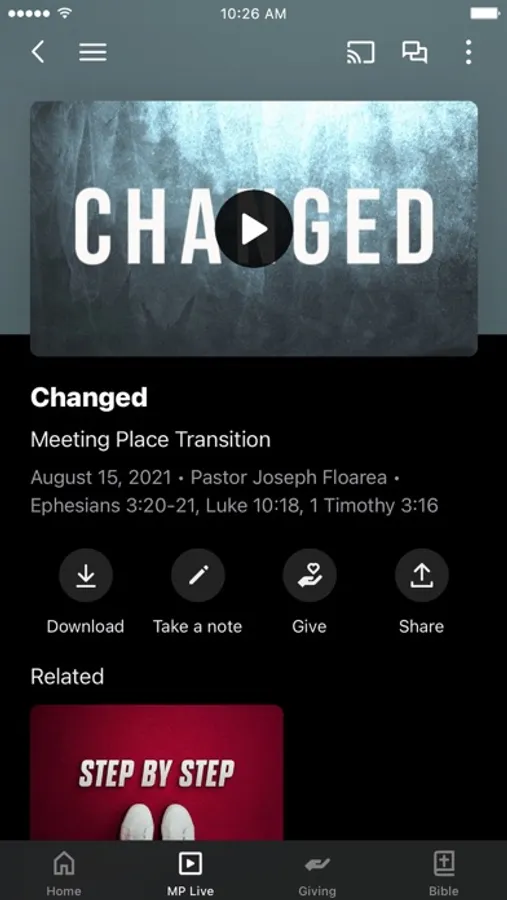 This app will help you stay connected with the day-to-day life of our church. With this app you can: watch or listen to past messages; stay up to date with push notifications; share your favorite messages via Facebook, YouTube, or email; and download messages for offline listening.