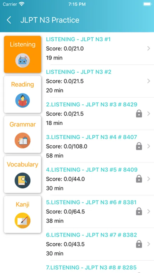 Practice skills: listening, reading, grammar, vocabulary, kanji