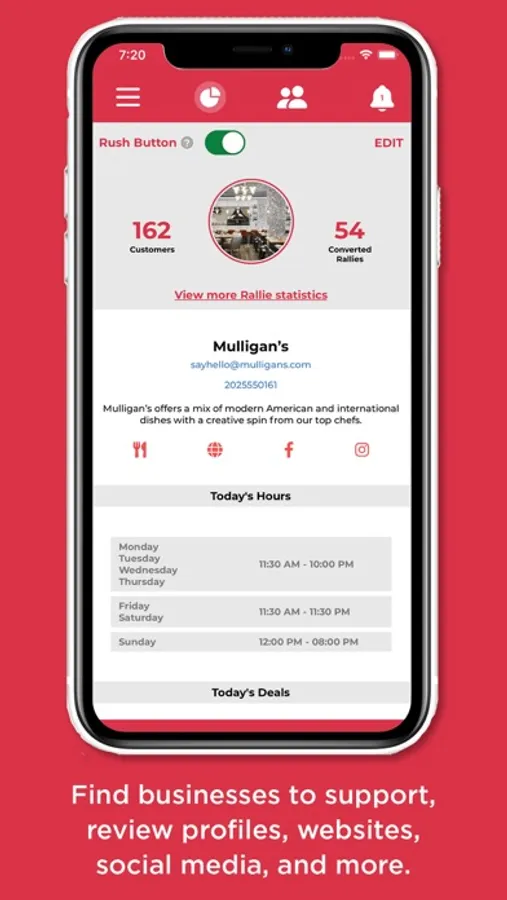 For businesses, Rallie is a marketing tool that will increase exposure, introduce live communication, and manage the expectations of customers. Businesses will attract new customers, share accurate hours of operation, release special deals and promotions, and evaluate real-time metrics without a huge marketing expenditure. Businesses have the ability to “Control The Rush” by turning their listing on or off instantly. This eliminates over-crowding and poor reviews. When businesses need to fill their seats and reach the public, they Rallie.