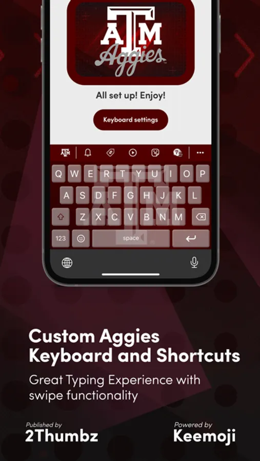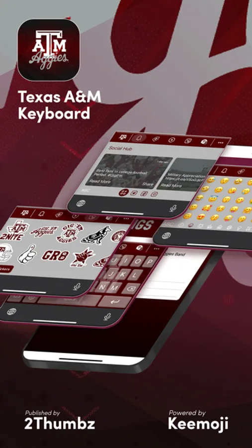 TEXAS A&M Official Keyboard is the officially licensed fan app for enjoying the full A&M experience. This app is owned and published by 2Thumbz, a leading mobile app development company and a trusted collegiate publisher since 2003.