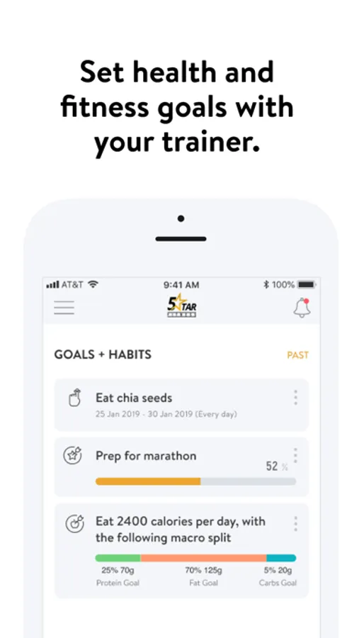 With the 5 Star Fitness App, you can start tracking your workouts and meals, measuring results, and achieving your fitness goals, all with the help of your personal trainer.