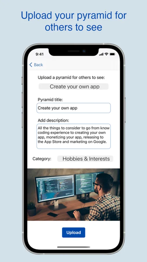 - Upload your pyramids for people to see, either to ask for feedback or to inspire others.