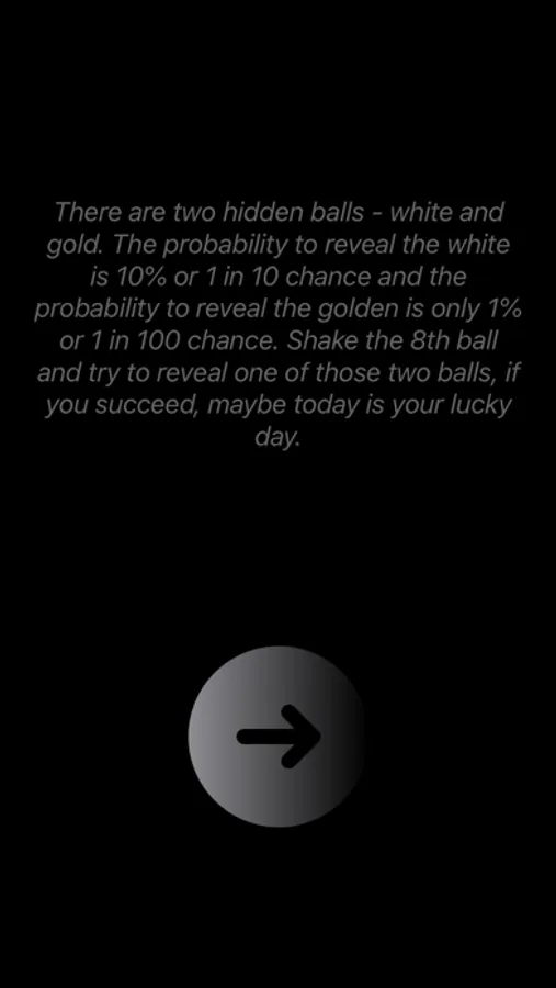 In the "Lucky ball" game mode, there are two hidden balls - white and gold. The probability to reveal the white is 10% or 1 in 10 chance and the probability to reveal the golden is only 1% or 1 in 100 chance. Shake the 8th ball and try to reveal one of those two balls, if you succeed, maybe today is your lucky day.