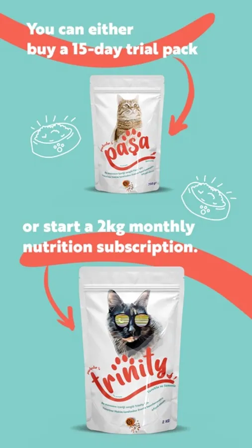 The airtight packaging is designed with the cat's name and photo and sent to your address every month in protected boxes.