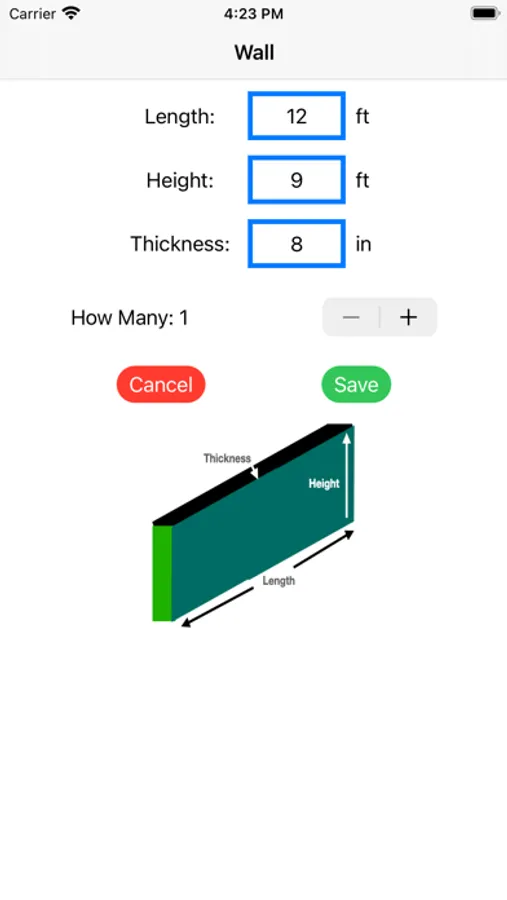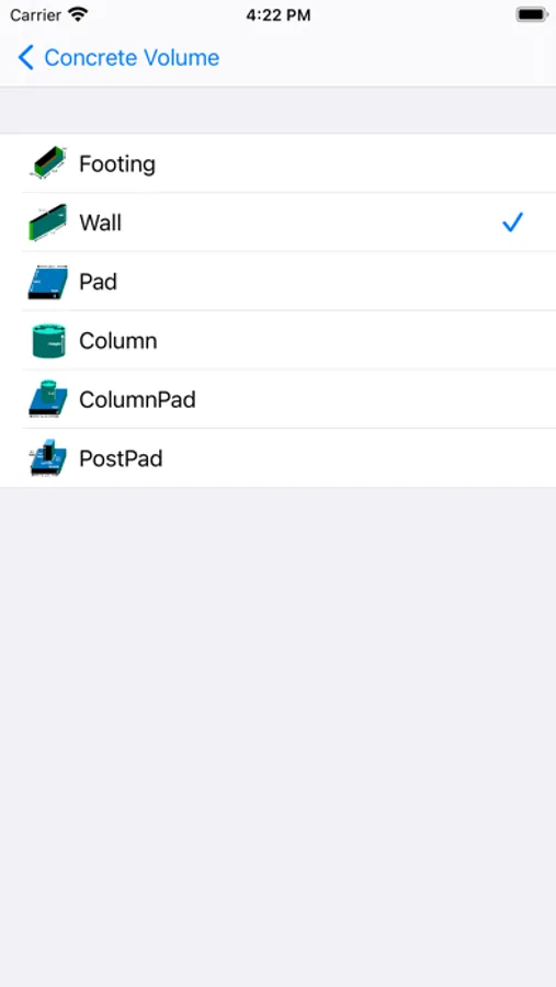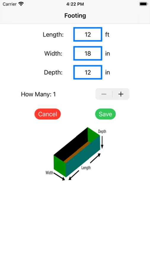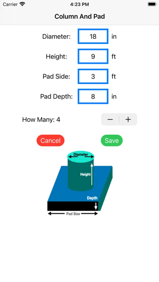 Finds volume of Concrete required based on inputs to various area types. Includes Footing, Wall, Pad/Slab, Column, Column with Pad, and Rectangle with Pad.
