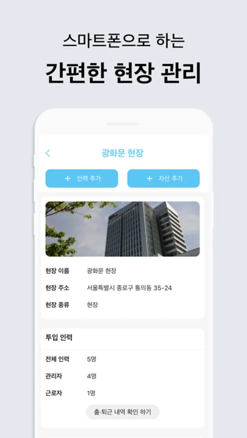 어디GO는 별도의 출역 관리기 없이 근로자의 스마트폰으로 출역을 등록하고, 근로자가 인증한 출역 내역을 언제, 어디서든 확인하고 출력할 수 있습니다.