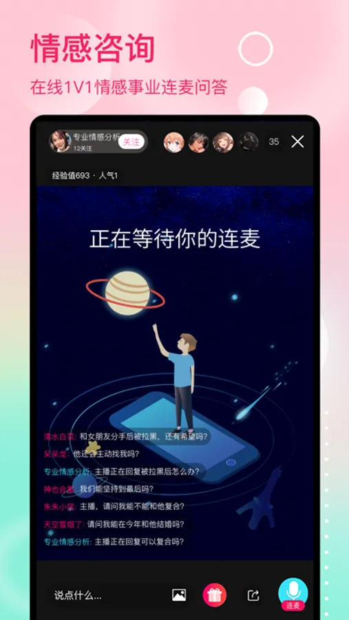 在去问你可以直接与星座达人和占星师还有心理及情感导师连麦聊天.