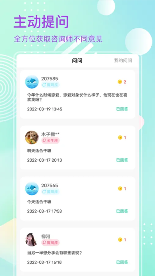 在问答社区你可以直接向星座达人,心理达人,情感导师提问.