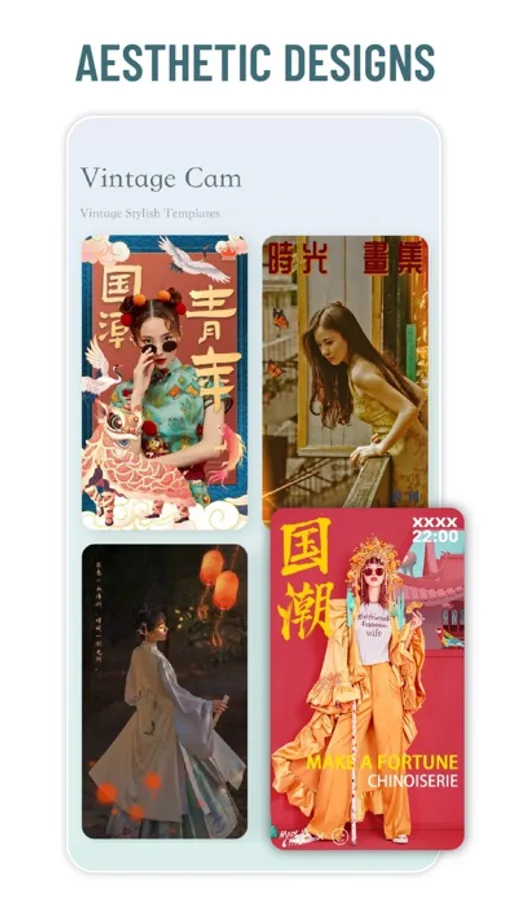 You can enjoy the most popular Chinese elements like Hong Kong retro style, ancient Chinese style and Guochao in Vintage Cam. It has the advanced AI feature that can recognized the portrait, you can try the best outfit that matches you perfectly, no need to takes time to prepare the costume, props or makeup any more. You can also surprise your friends by showing them how good looking you are in traditional Chinese painting. What's more, with the vast collection of classic filters and buckground color, you can easily create the blockbuster in your social.