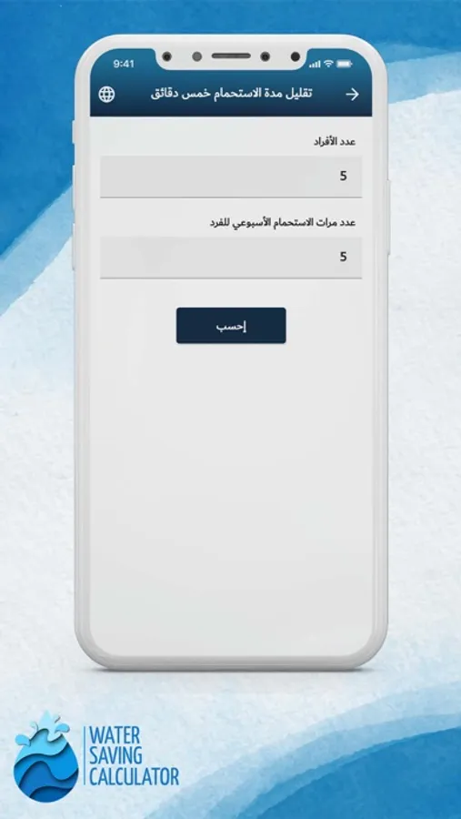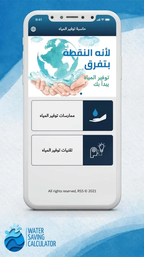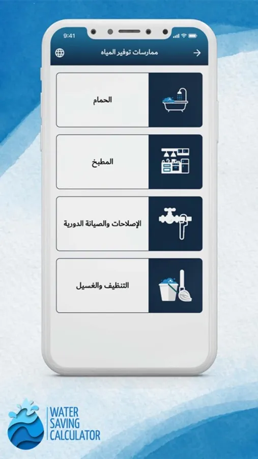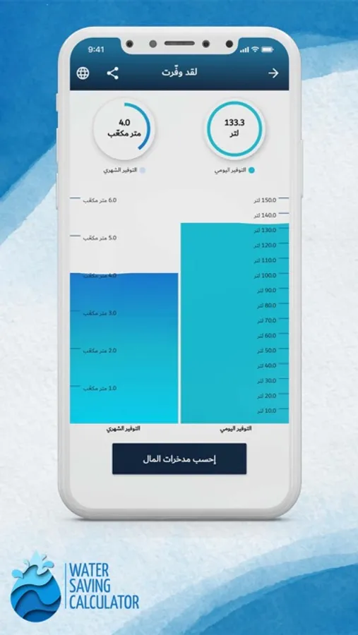 This application provides the feature of calculating the amount of water saved by adopting a number of water-saving practices when using water in the bathroom, kitchen, cleaning, and washing, in addition to the water saved when adopting simple practices related to regular repairs and maintenance.