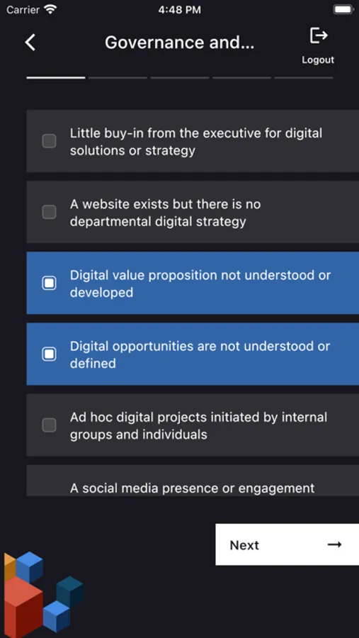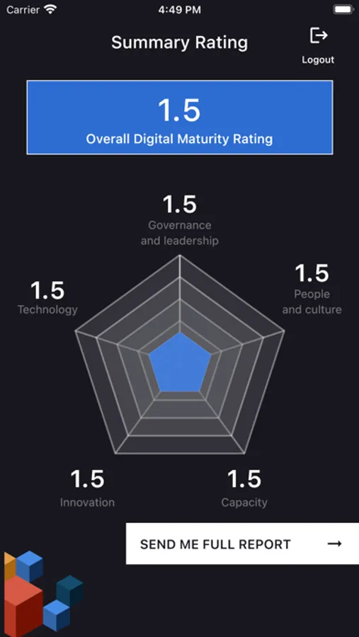 Use the app to quickly rate your overall digital maturity. It will show the fields that your company should improve, either in Technology, Governance & Leadership, People & Culture, Capacity & Capability or Innovation. This is a great tool to help you in your Digital Transformation journey, to understand where you are and what need to be done. Full report will be available with detailed plan and guide, starting from building small and workable MVPs.