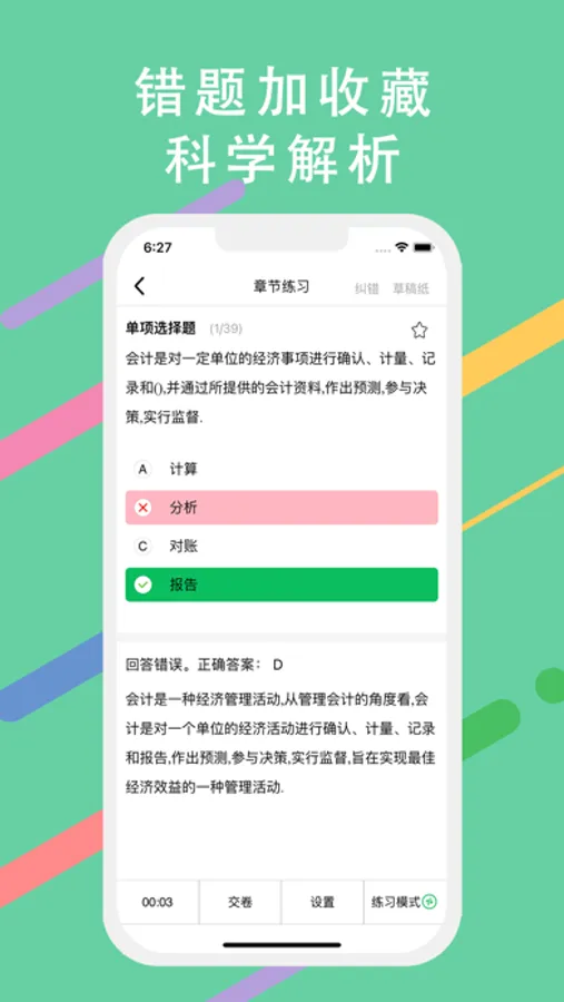会计考试网考试题库是一款随时随地可用的智能高效刷题软件。考生可通过设置备考目标,快速开启高效提分计划。同时我们拥有超大型在线题库,主要功能包括章节练习、随机练习、高频考题、历年真题,模拟考试等多种形式,让学生边学边练,达到进一步巩固学习效果的目的。在考前冲刺阶段还有考前模拟试题,帮助学员模拟实战,把握考试精髓,增加考试通过率。