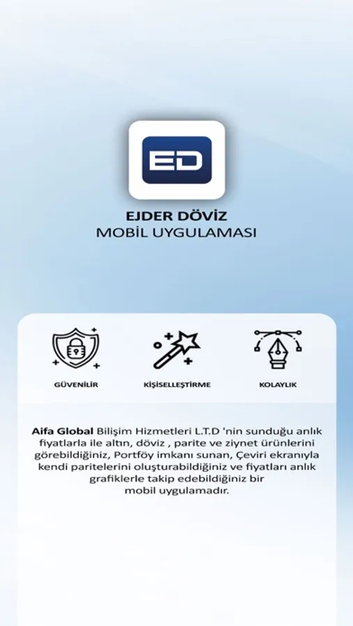 Aifa Global Bilişim Hizmetleri L.T.D 'nin sunduğu anlık fiyatlarla ile altın, döviz , parite ve ziynet ürünlerini görebildiğiniz , Portföy imkanı sunan, Çeviri ekranıyla kendi paritelerini oluşturabildiğiniz ve fiyatları anlık grafiklerle takip edebildiğiniz bir mobil uygulamadır.