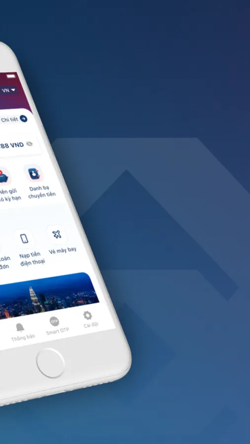 - Đổi mật khẩu, kích hoạt Smart OTP/ Sinh trắc học và chọn ngôn ngữ (tiếng Việt và tiếng Anh) (Allow to change password, activate Smart OTP/Biometric authentication and select your preferred application languages available in Vietnamese and English)
