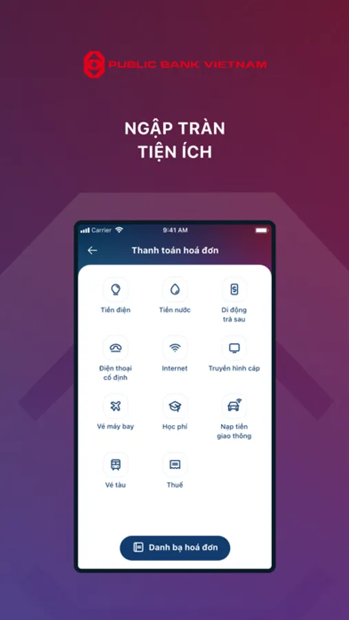 Thanh toán hóa đơn cho các dịch vụ thiết yếu như điện, nước, truyền hình cáp, internet, vé máy bay, điện thoại… (Pay bills for essential services such as electricity, water, VTVCab, internet, air tickets, telecommunication and many more).
