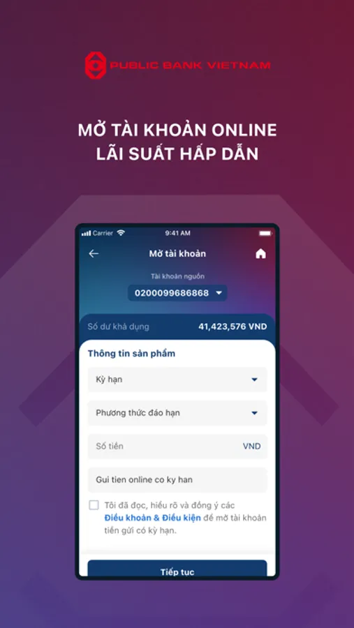 Quý khách có thể mở và tất toán tài khoản tiền gửi có kỳ hạn ngay trên ứng dụng mà không cần đến các quầy giao dịch để thực hiện (Allow you to open and withdraw deposit account on the application without going to the transaction counter directly)