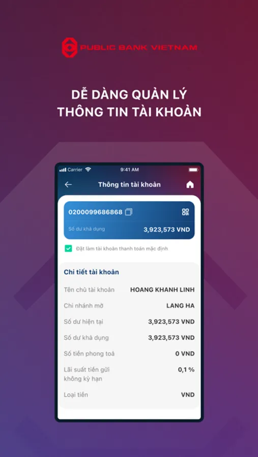 - Để biết them thông tin, vui lòng truy cập trang web https://www.publicbank.com.vn hoặc liên hệ hỗ trợ khách hàng 1800599930/842438262000 hoặc gửi email đến hòm thư customerservice@publicbank.com.vn (To find out more, please visit https://www.publicbank.com.vn or contact out customer support at 1800599930/842438262000 - or email us at customerservice@publicbank.com.vn)