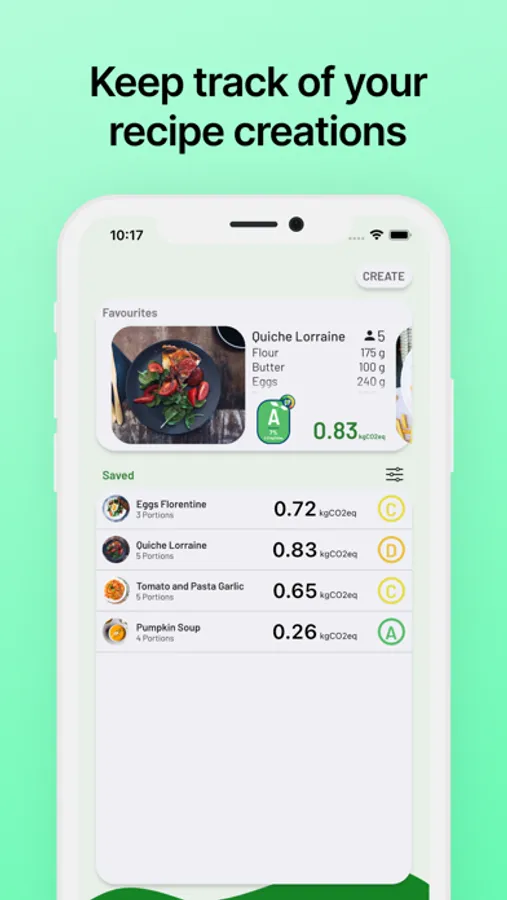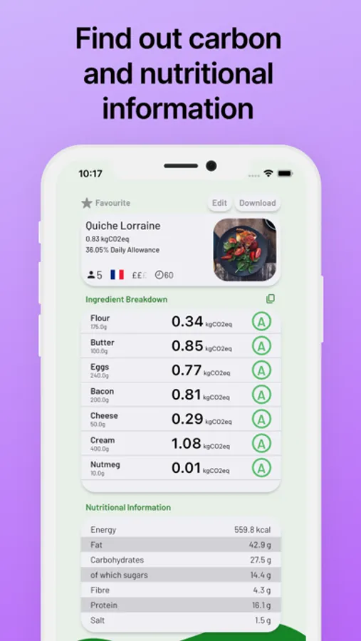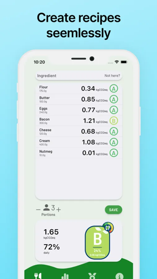 Instantaneously compute the climate impact of each ingredient, as well as the total impact of the entire recipe.