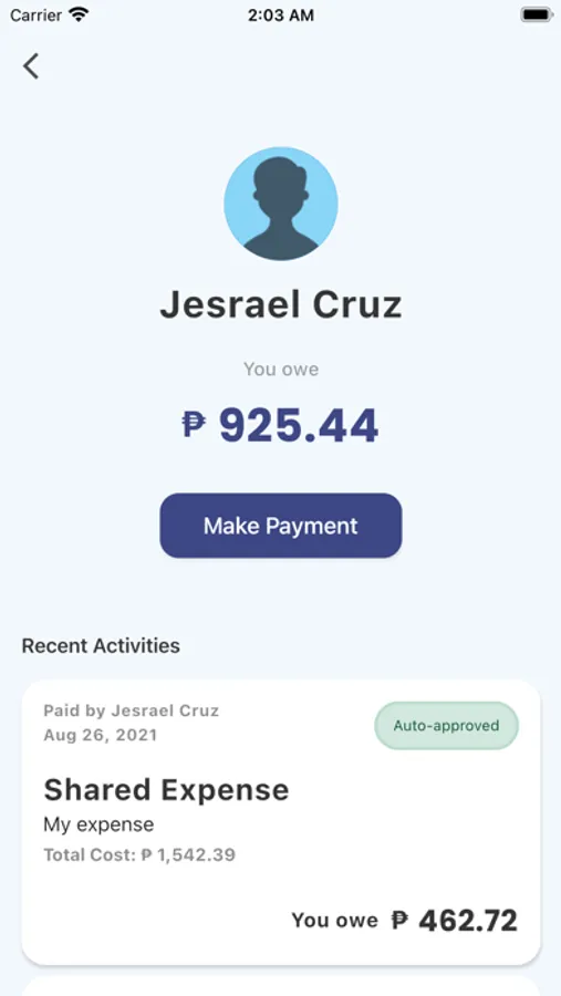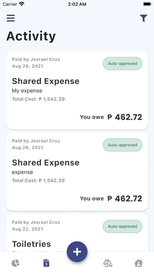 Once an expense is recorded, it will automatically appear on each members' dashboard to see how much money you owe to whom or to receive from whom.