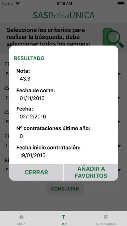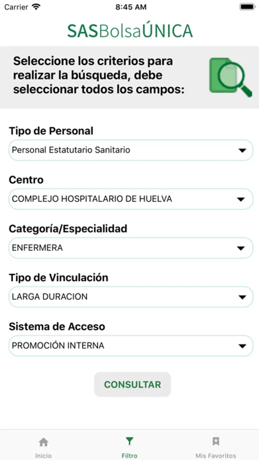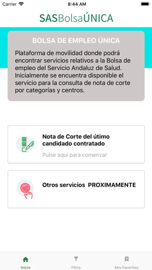 Plataforma oficial de movilidad donde podrá encontrar servicios relativos a la Bolsa de empleo del Servicio Andaluz de Salud. Inicialmente se encuentra disponible el servicio para la consulta de la nota de corte del último candidato contratado por categorías y centros.