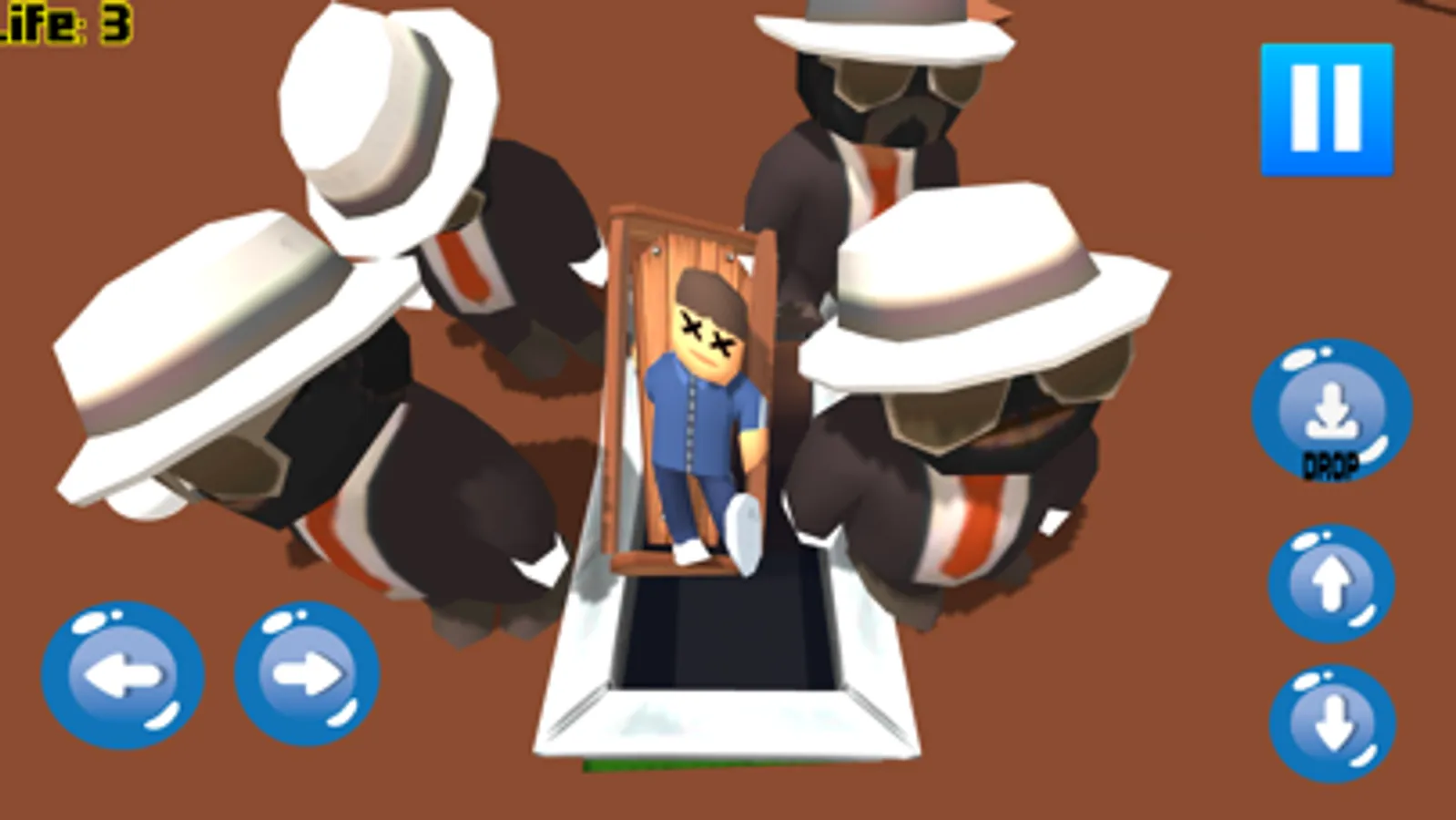 There are pallbearers dancers with a coffin. A funny ragdoll physics character that needs to go in the grave. You know what to do.