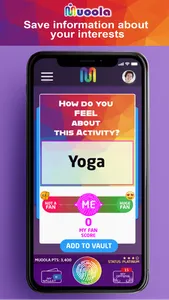 * Have fun adding preferences to your vault. We have made adding information to your personal vault easy and fun. Every day Muoola will ask you a few questions about how you feel about certain brands, movies, music, organizations, etc. Every opinion gets added to your vault and increases your vault's value. Soon the information you have control of about yourself will become more valuable than the data the social media companies and search companies have about you.