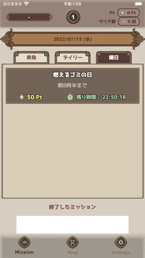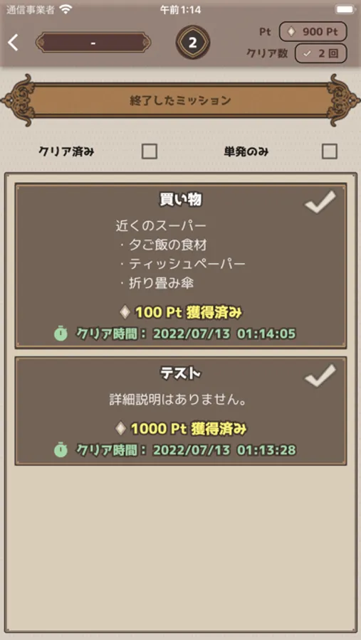 クリアしたミッションも、出来なかったミッションも、記録されていきます。いつ終わらせたのかや、いつ出来なかったのかを記録して、振り返ってみましょう!