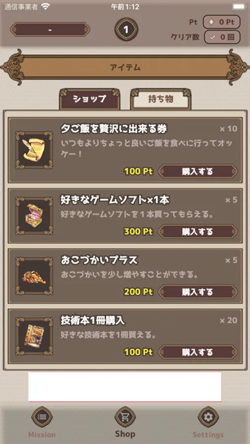 報酬ポイントで購入出来る、自分へのご褒美アイテムを作成しよう。