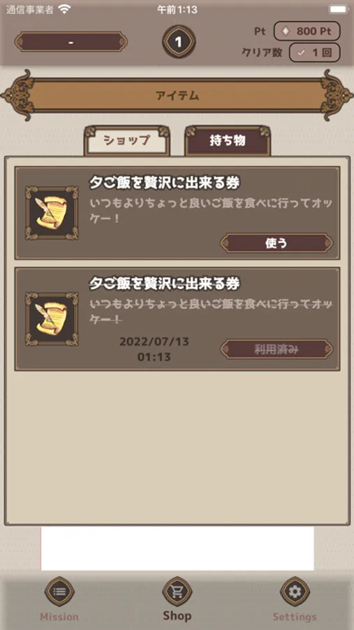作成したアイテムはショップアイテムとして販売され、ミッションをクリアして貯めた報酬ポイントで購入出来ます!