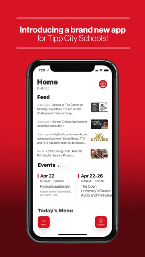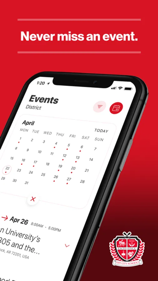 The event section shows a list of events throughout the district. Users can add an event to their calendar to share the event with friends and family with one tap.