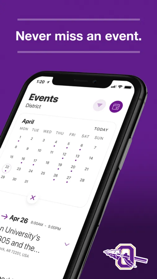 The event section shows a list of events throughout the district. Users can add an event to their calendar to share the event with friends and family with one tap.