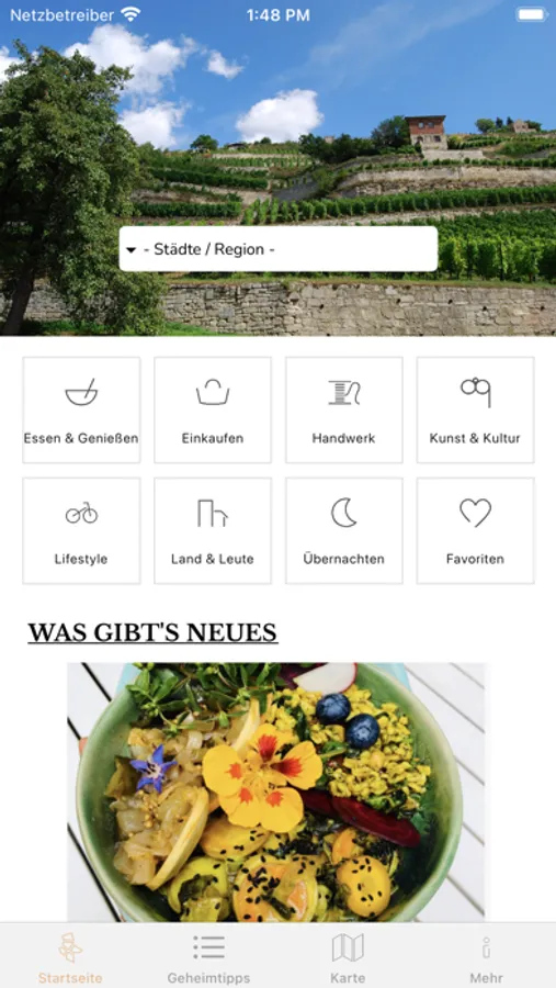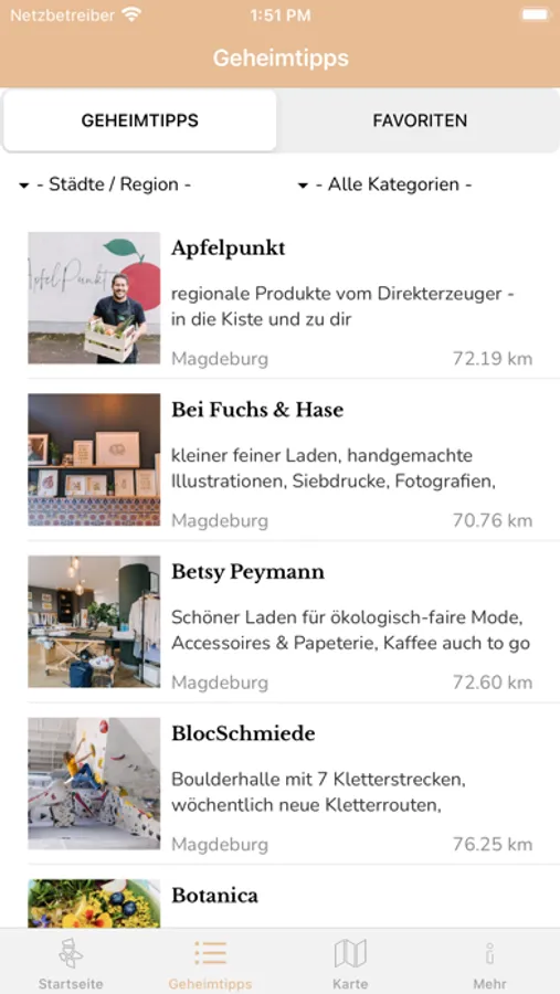 Orientiere dich einfach nach Kategorien und Regionen. Merke dir deine Lieblingsorte unter Favoriten oder teile die Geheimtipps direkt mit deinen Freunden. Unsere Karte gibt dir einen Überblick über Tipps direkt in deiner Nähe. Lass dich einfach leiten, nimm dir eine Auszeit und begib dich auf Entdeckungsreise.