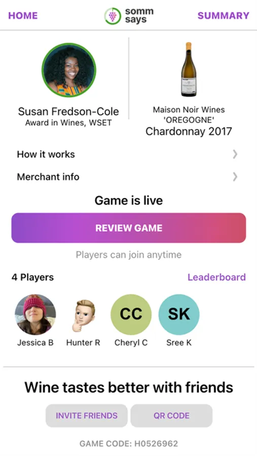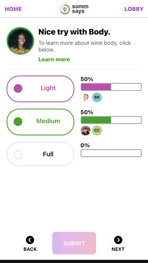 Over six rounds of questions about common wine characteristics players attempt to see who knows what the Somm Says. Each round provides instant feedback by comparing your answer to the Sommelier and your friends and shows you what all other players on the platform say about a particular wine.