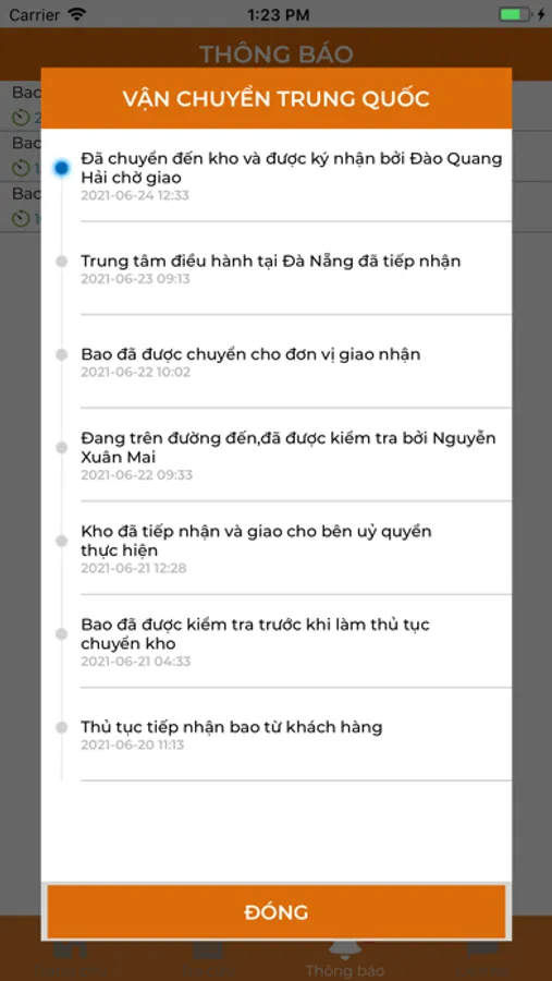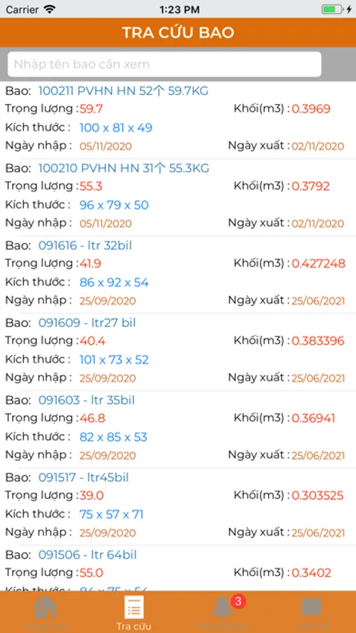 - Kiếm tra lịch sử di chuyển của bao hàng đó