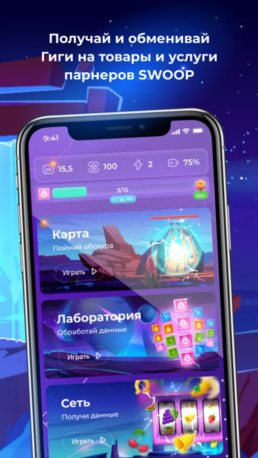Загружай Swoop, гуляй по своему городу, находи кристаллы и получай за них Гиги. Что с ними делать дальше? Решать тебе!